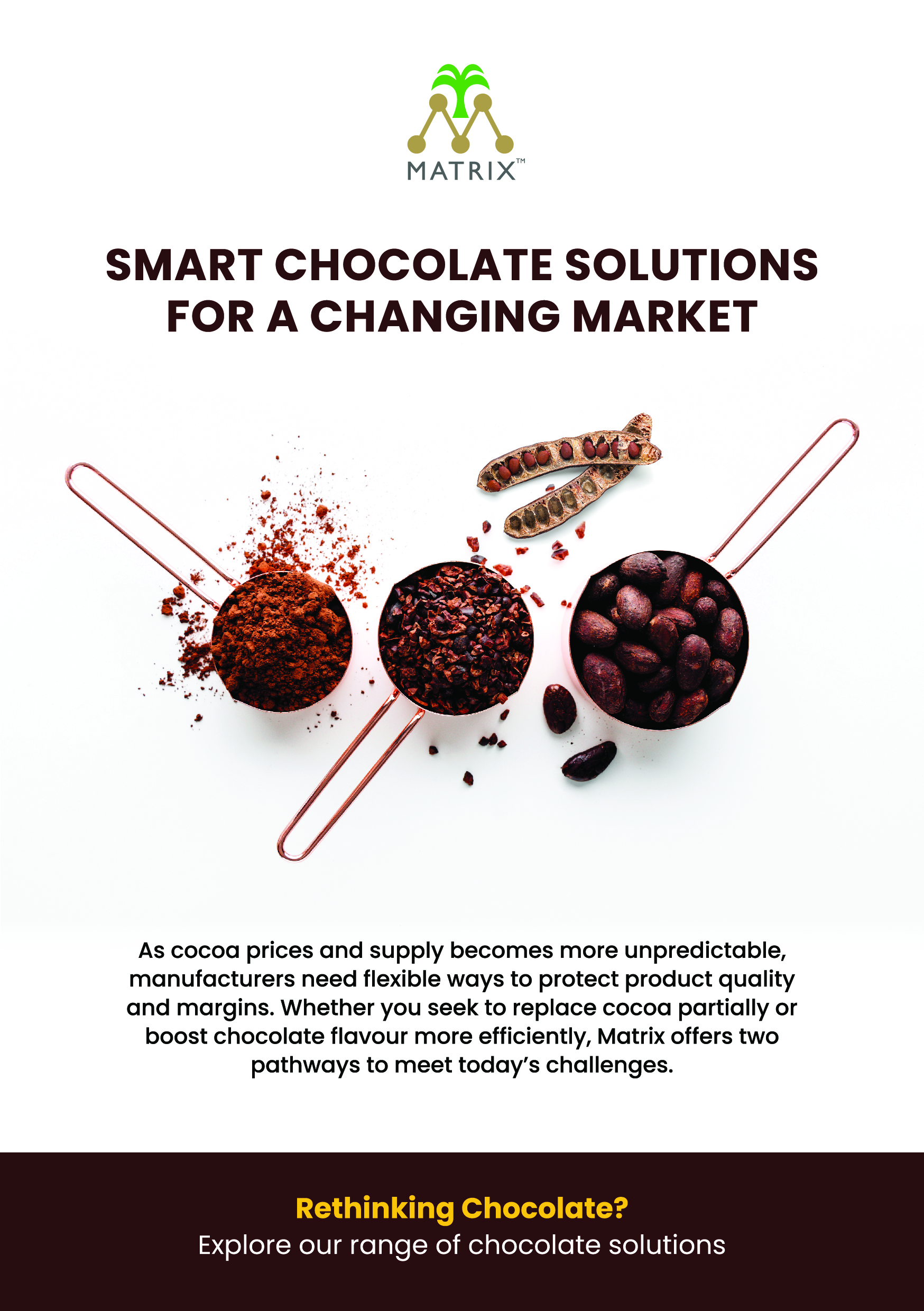 As cocoa prices and supply becomes more unpredictable, manufacturers need flexible ways to protect product quality and margins. Whether you seek to replace cocoa partially or boost chocolate flavour more efficiently, Matrix offers two parthways to meet today’s challenges