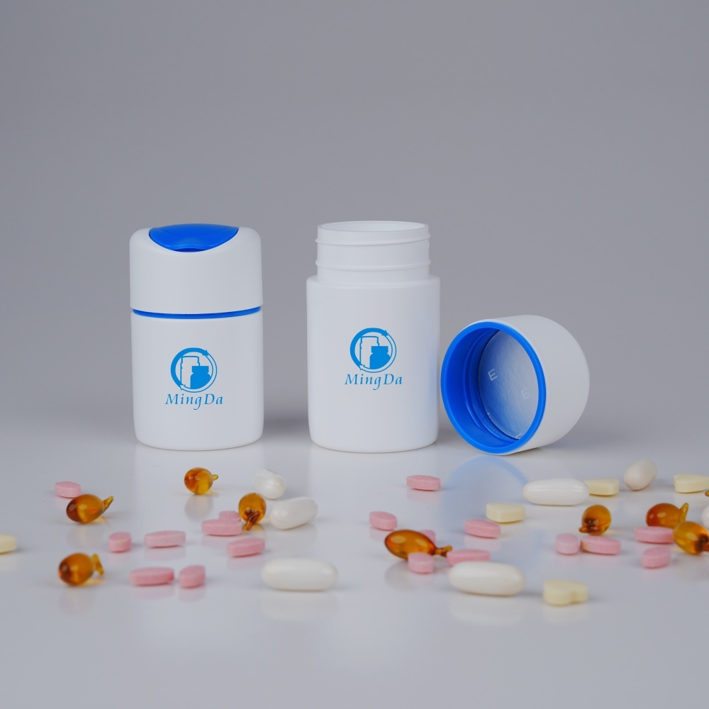 This plastic jar is a practical container designed for health supplements and sports nutrition capsules. It is made of high-density polyethylene (HDPE), which is both lightweight and durable. It can effectively prevent moisture and leaks, protecting the nutrients inside from the outside environment.The top of the jar is equipped with a one-button opening and closing flip cover design, which can be easily operated with one hand, making it particularly convenient to take supplements. This material is safe and non-toxic, meets food-grade standards, and there is no need to worry about chemical reactions with medicines or nutritional supplements.