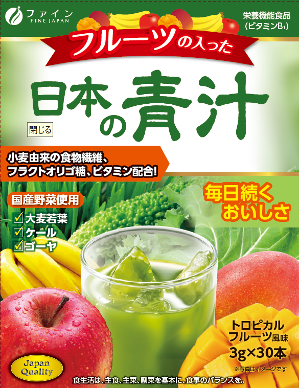 Your delicious tropical fruit-flavored Japanese green drink for daily health support! This product is formulated with 3 kinds of Japan-produced vegetables (young barley, kale, bitter gourd) as its main ingredients with added oligosaccharides, dietary fiber from wheat and Vitamins. Moreover, fruit is added to make it easier to drink even for those who do not like green juice. You can therefore take in various nutrients contained in green juice. This can be a daily health support for those who tend to have an unbalanced diet and those who lack in vegetable intake.