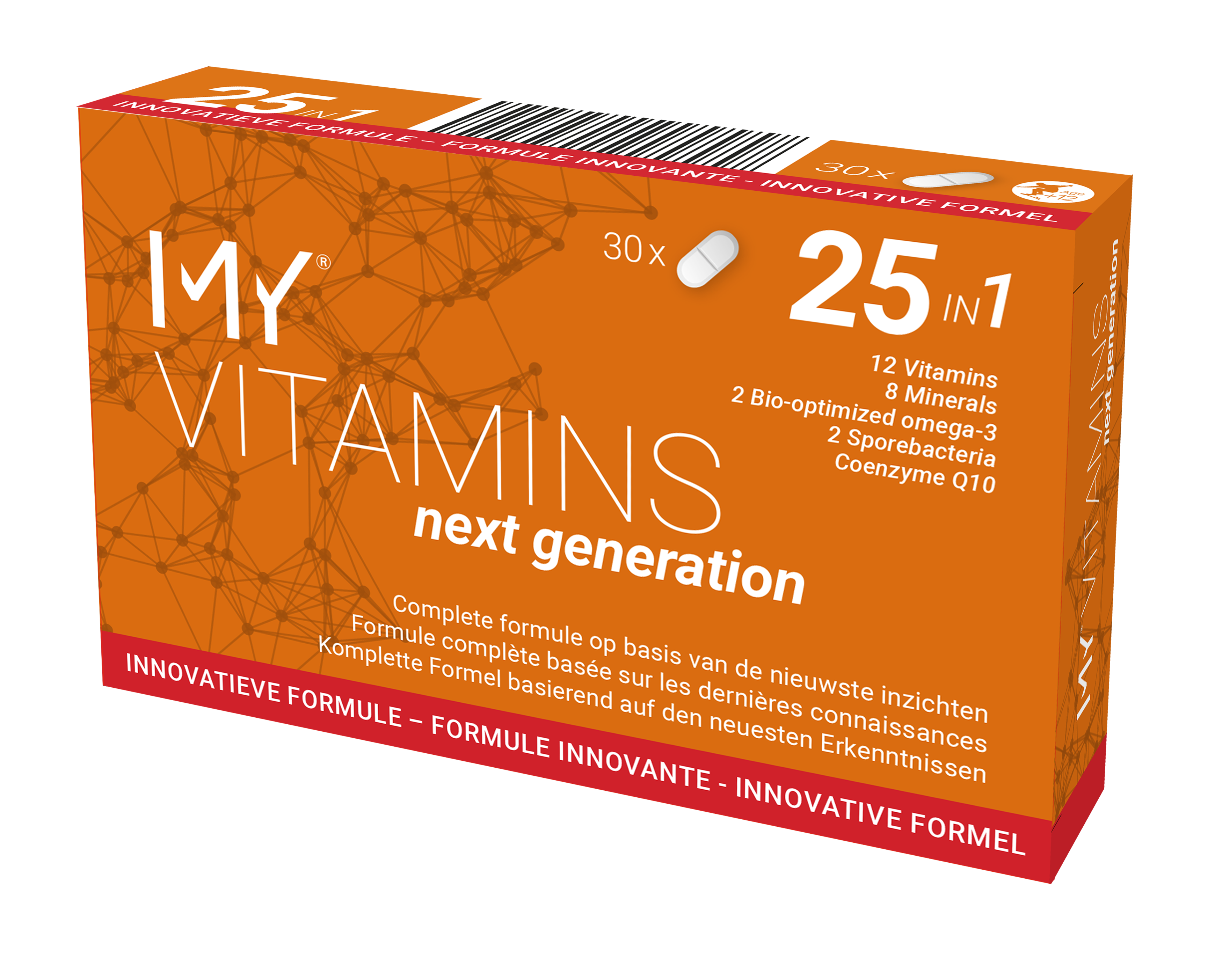 MY®VITAMINS Next Generation is a 25-in-1 comprehensive daily supplement combining 12 vitamins, 8 minerals, omega-3 fatty acids (EPA & DHA), sporebiotics®, and coenzyme Q10 to support overall health and vitality.