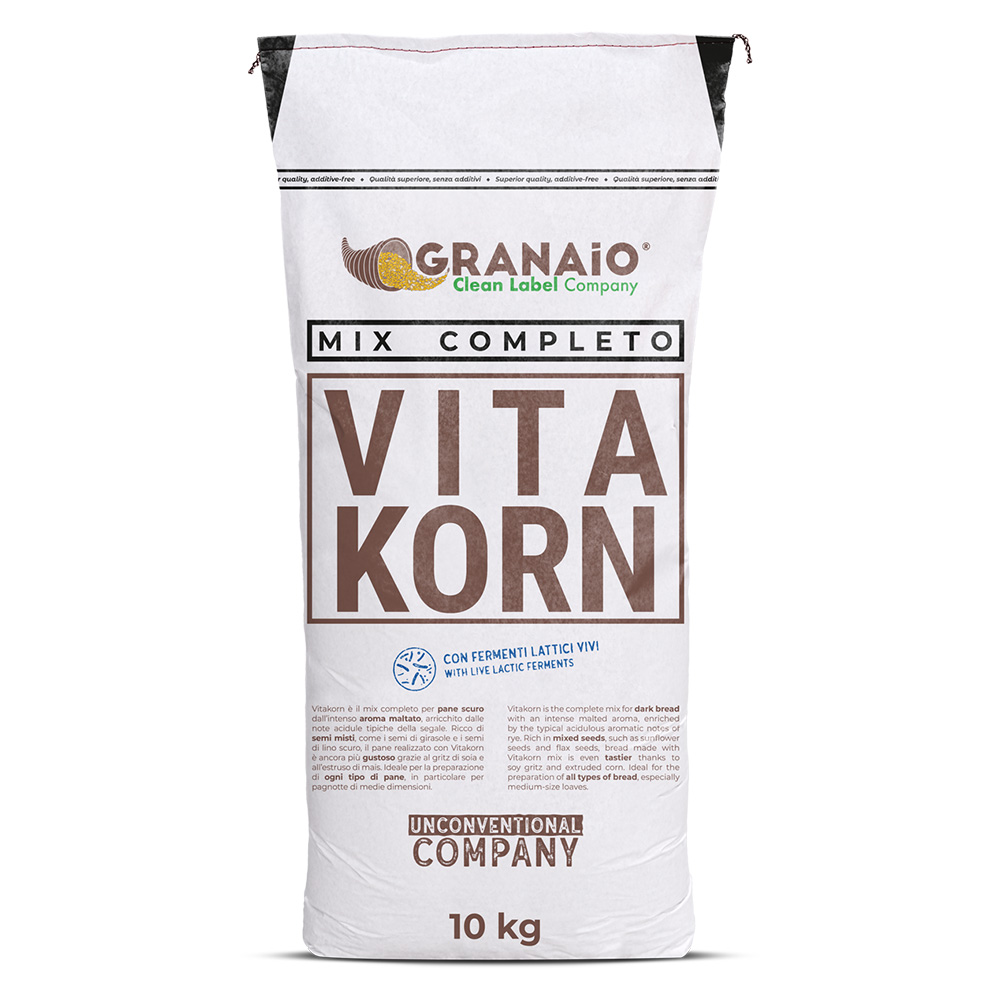 Vitakorn is the complete mix with Live Lactic Ferments, for dark bread with an intense malty aroma, enriched by the typical sour notes of rye. It contains a rich blend of mixed seeds: sunflower seeds, flax seeds, sesame seeds. Bread made with Vitakorn mix is even tastier thanks to the soy gritz and extruded corn. Ideal for making all types of bread, especially medium-sized loaves.