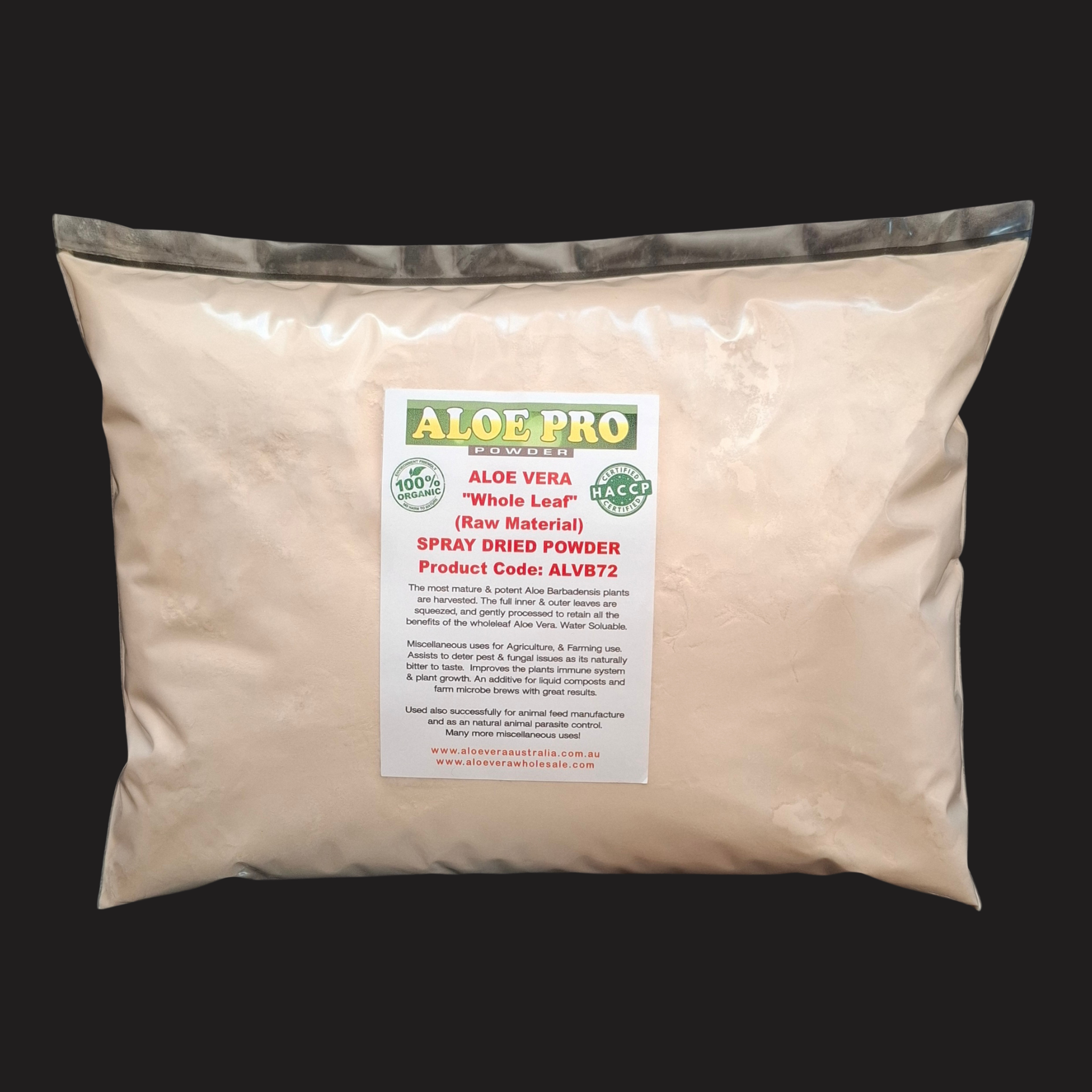 Please note that this Aloe Powder is manufactured by utilizing the complete inner and outer leaf of the Aloe Vera. Approximately 100KG of Organically Grown whole leaf Aloe Vera is used to make 1KG. The end result powder is naturally “bitter to taste” and measures approximately 10-15% barbaloin/aloin so if taken internally can act as a laxative. Also many benefits available for growing and farming, to minimize pest attacks on crops or as an additive to soil and foliar treatment products. 100% soluble in water.